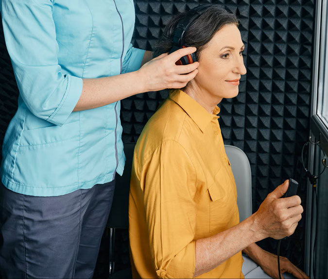 Audiometria so slúchadlami – presne určuje sluchové prahy pre každé ucho zvlášť.